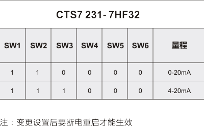 EM231電流型輸入溫控模塊支持0—20mA的電流,模塊提供了一個(gè)6位的DIP開關(guān)用于選擇測量范圍,6位的DIP開關(guān)位于模塊的