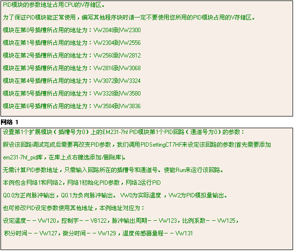 為了保證PID模塊能正常使用,編寫其它程序塊時(shí)請一定不要使用您所用的PID模塊占用的V存儲區(qū)。