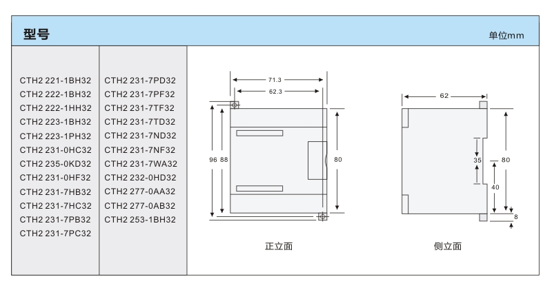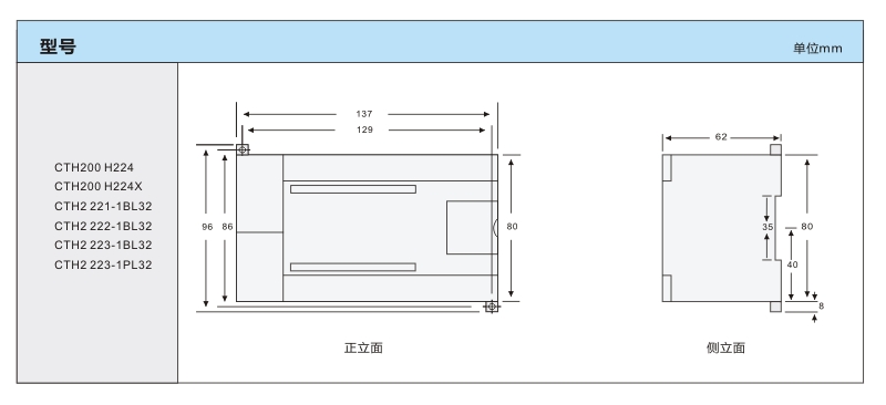 數(shù)字量輸入/輸出模塊, 8點(diǎn)24VDC輸入,8點(diǎn)晶體管輸出, 24VDC,0.5A(輸出保護(hù)) | CTH2 223-1BH32 |